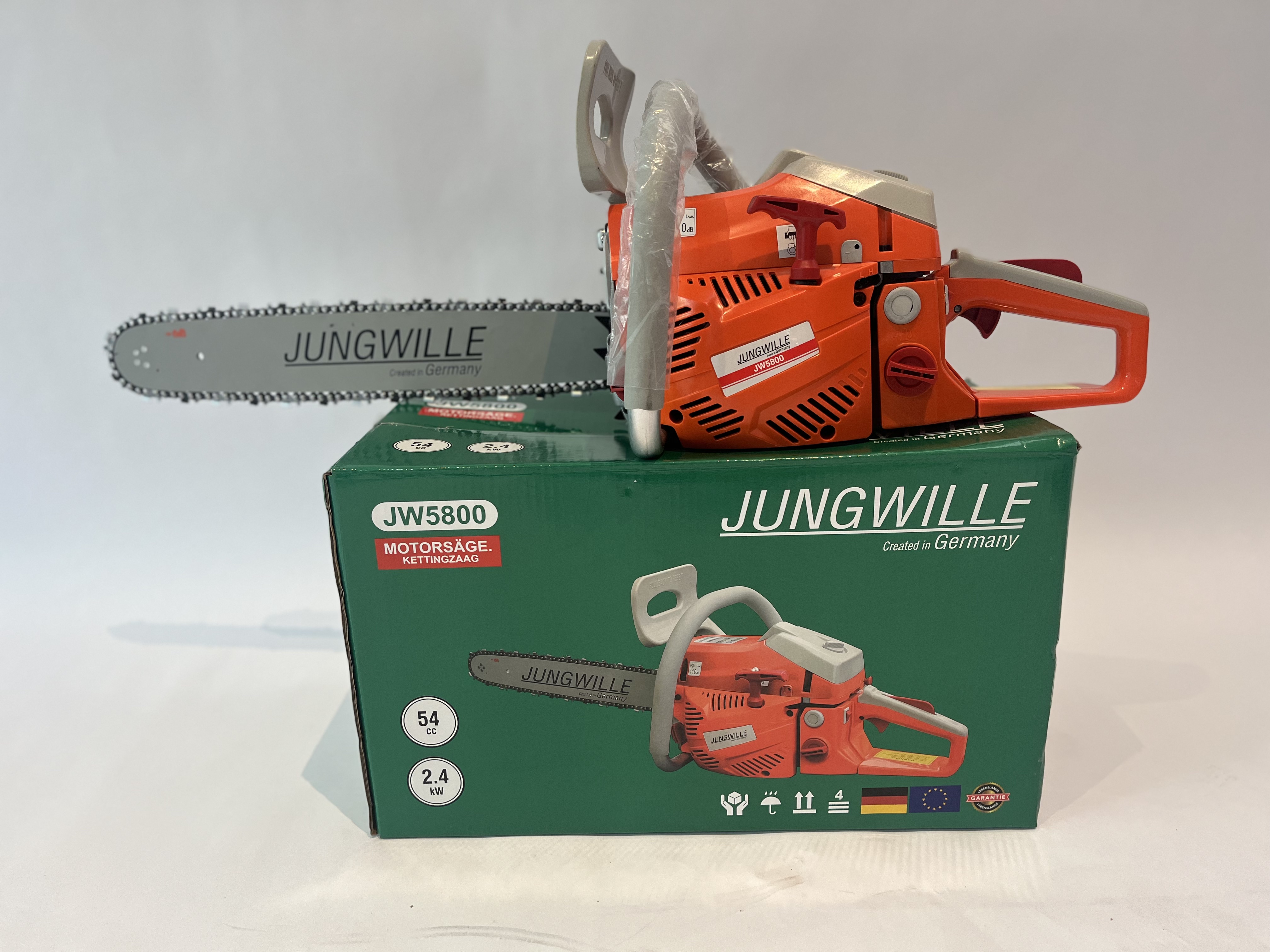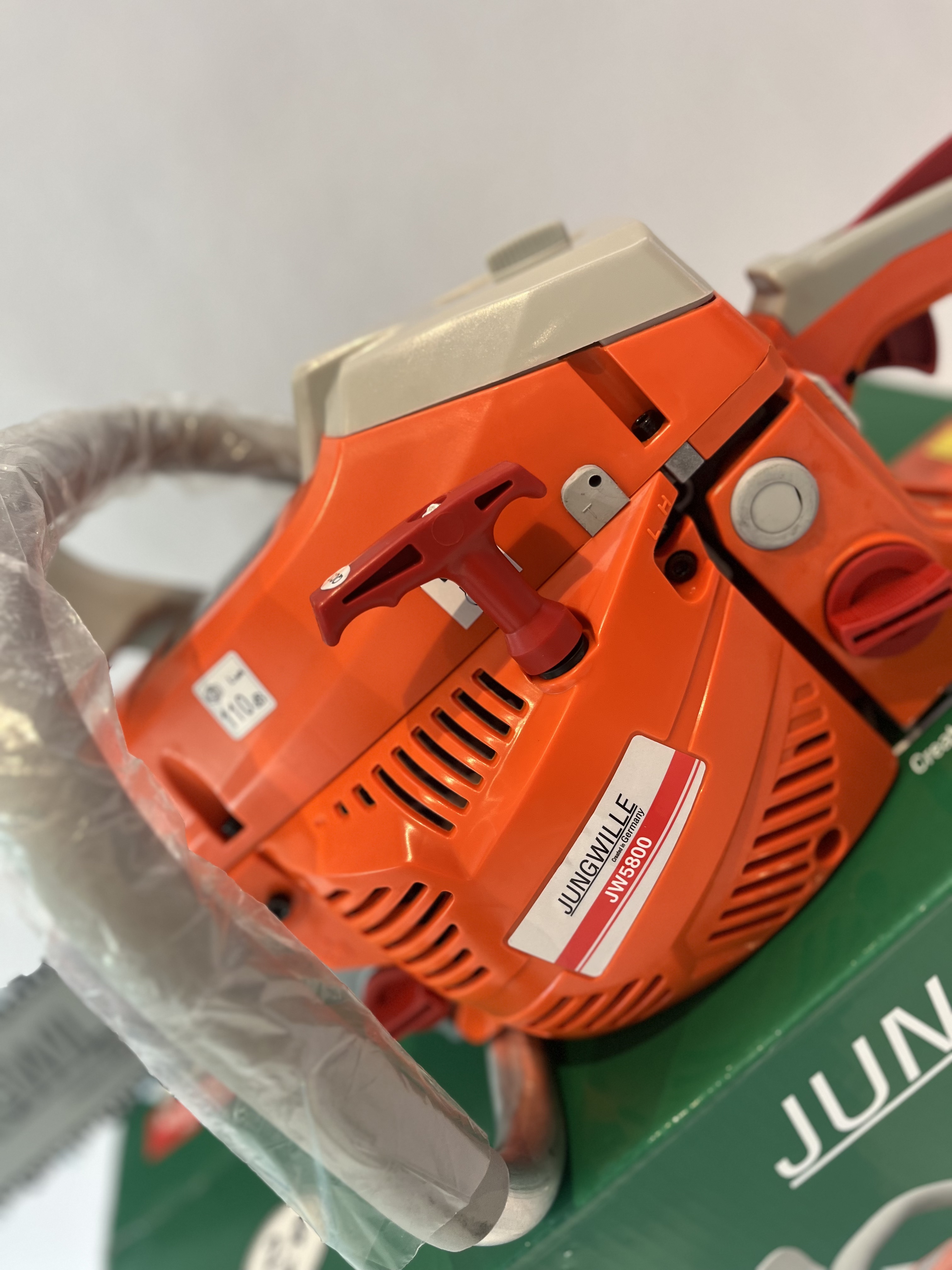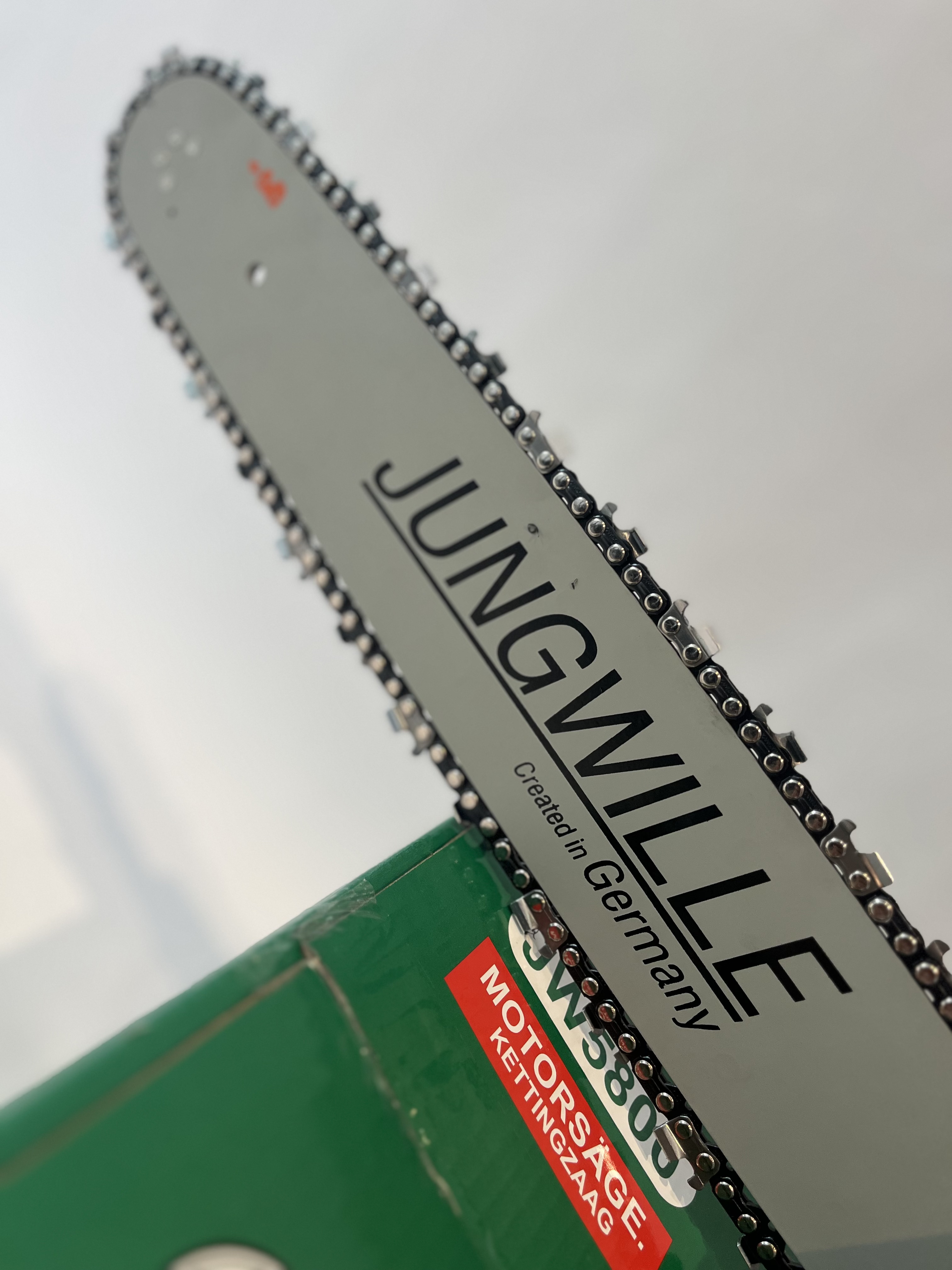 De Jungwille JW5800 is een krachtige benzinekettingzaag ontworpen voor veeleisend zaagwerk. Of je nu bomen wilt vellen, brandhout wilt zagen of grof snoeiwerk uitvoert, deze kettingzaag levert de prestaties en betrouwbaarheid die je nodig hebt. Ontwikkeld met Duitse precisie, staat Jungwille garant voor kwaliteit, duurzaamheid en gebruiksgemak – precies wat je mag verwachten van een merk dat is "Created in Germany".